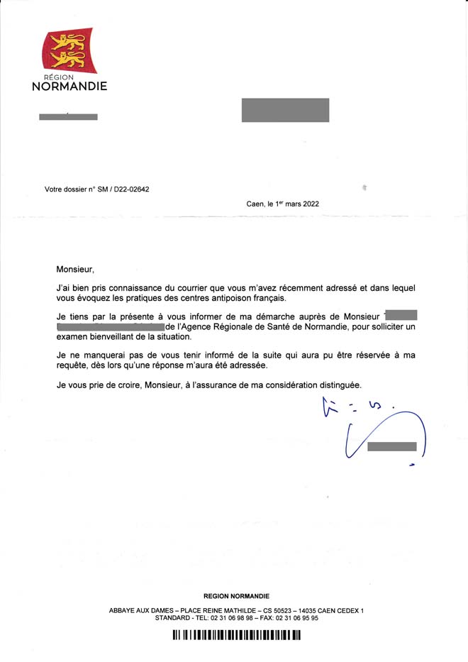 Comme ma plainte visait un service de l'Etat (Centre Antipoison), elle a donc été classée sans suite pour cette raison.